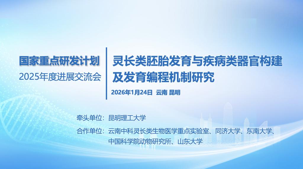 2026年1月24日,由昆明理工大學(xué)生命科學(xué)與技術(shù)學(xué)院、靈長(zhǎng)類轉(zhuǎn)化醫(yī)學(xué)研究院陳永昌教授主持的國(guó)家重點(diǎn)研發(fā)計(jì)劃“靈長(zhǎng)類胚胎發(fā)育與疾病類器官構(gòu)建及發(fā)育編程機(jī)制研究” 2025年度項(xiàng)目進(jìn)展交流會(huì)在昆明理工大學(xué)召開。